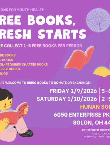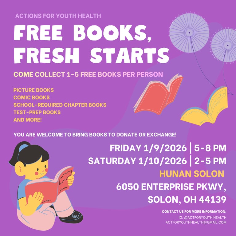 Help A4YH turn the page into 2026! Join us for a free book drive to kick off the new year. Stop by and browse through an assortment of books, then take home up to 5 books per person!